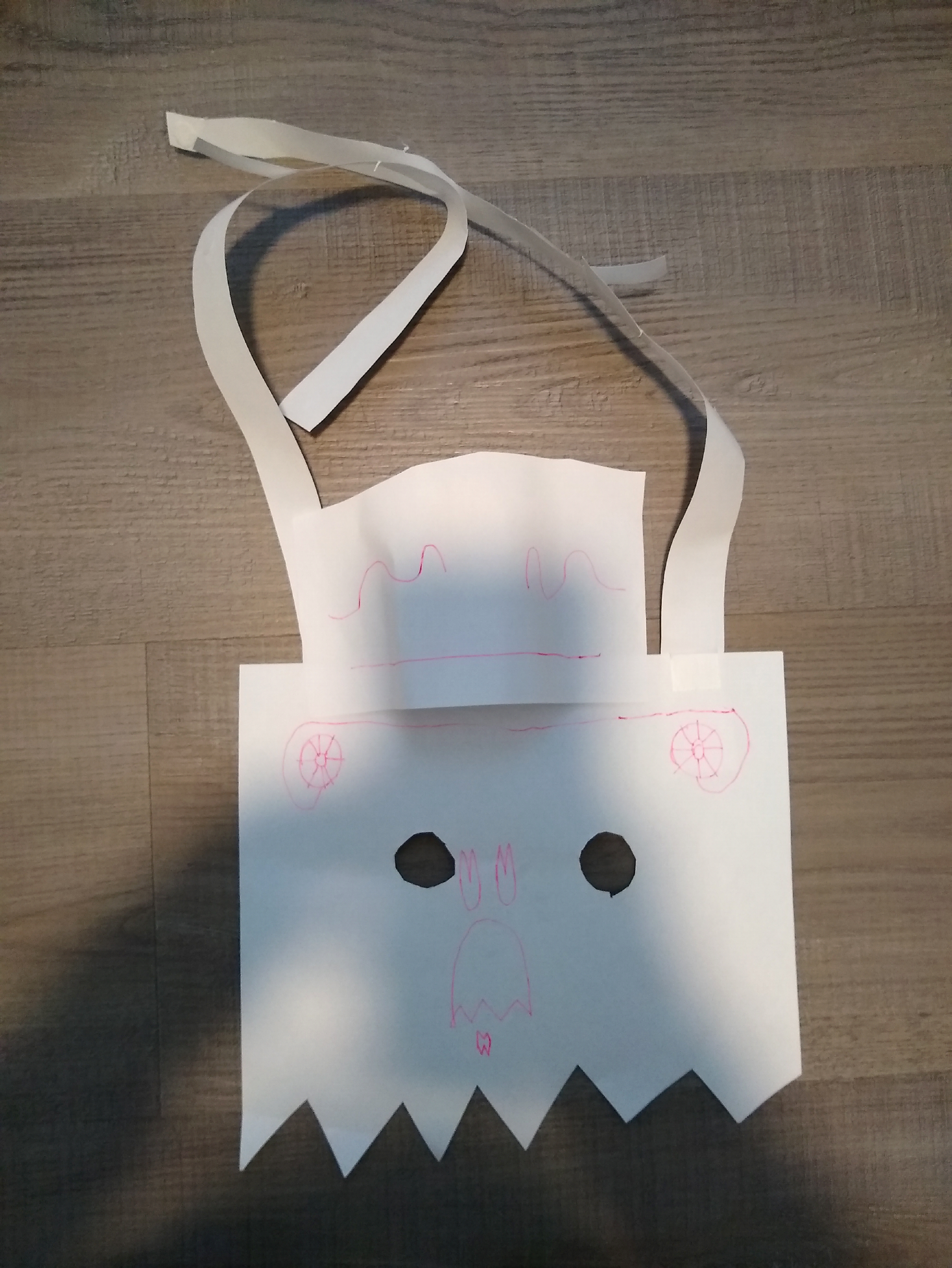 A paper wearing thing with a drawing of a face and a handle to insert it on the face